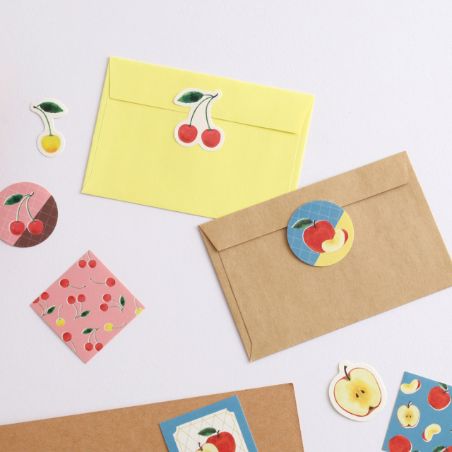 みずみずしいフルーツのイラストにカラフルなバイカラーを組み合わせたステーショナリーシリーズ