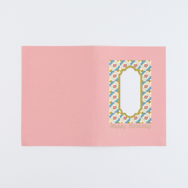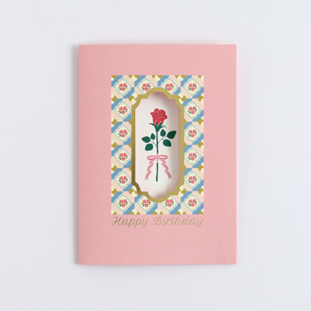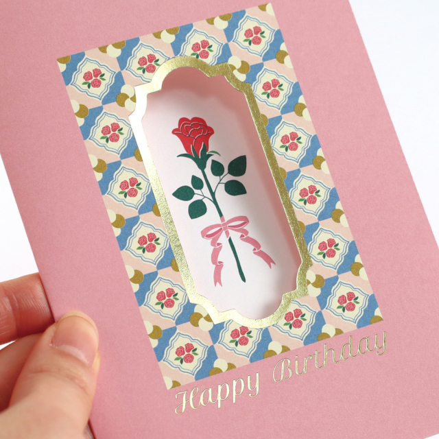 金箔押しが施された窓から一輪のお花が見える仕掛けとなっており、気分が明るくなるようなポップな色合いがかわいい、貰って嬉しいバースデーカードです。