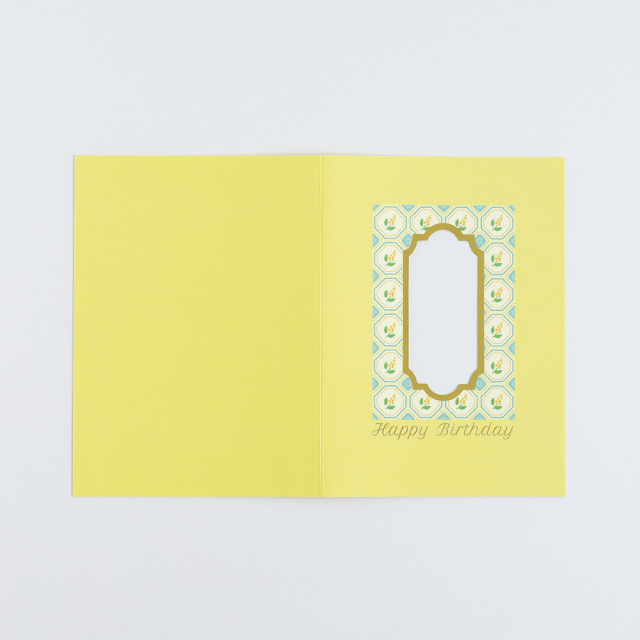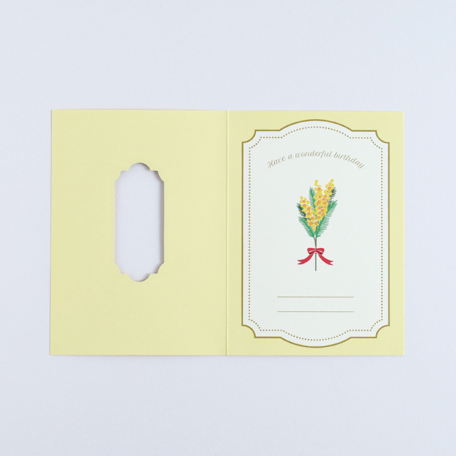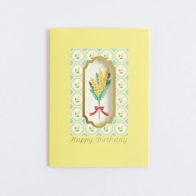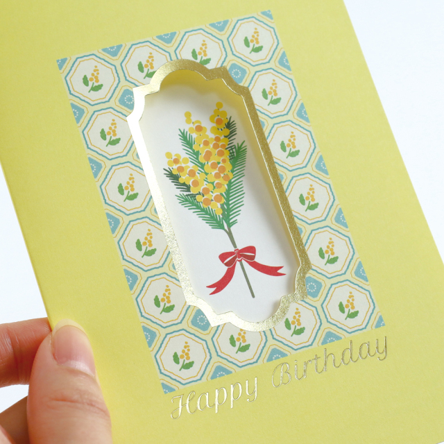 金箔押しが施された窓から一輪のお花が見える仕掛けとなっており、気分が明るくなるようなポップな色合いがかわいい、貰って嬉しいバースデーカードです。