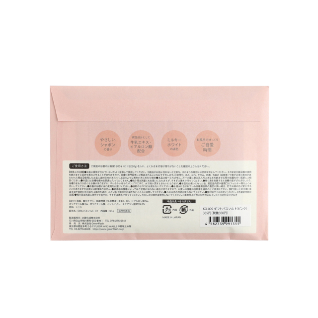 幅広く愛されるやさしいシャボンの香りのバスソルトが1包入っています。