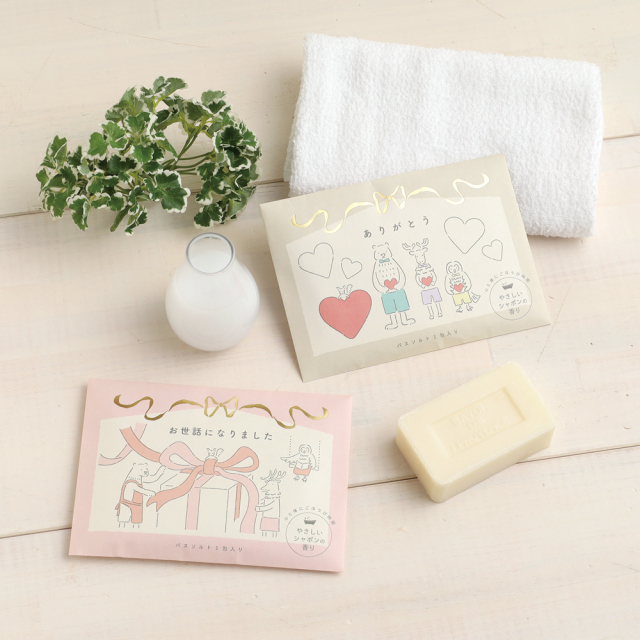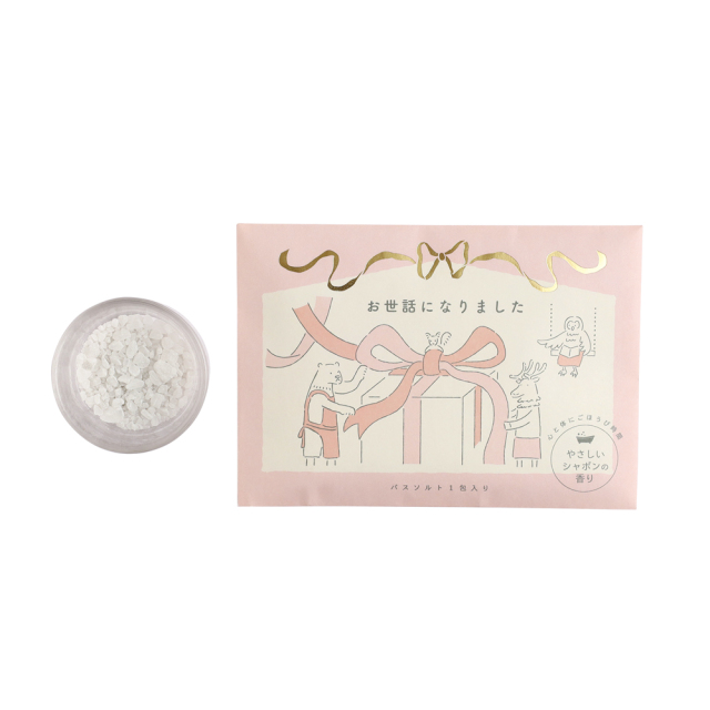 「お世話になりました」の一言がパッケージにデザインされたギフトにぴったりなバスソルトです。