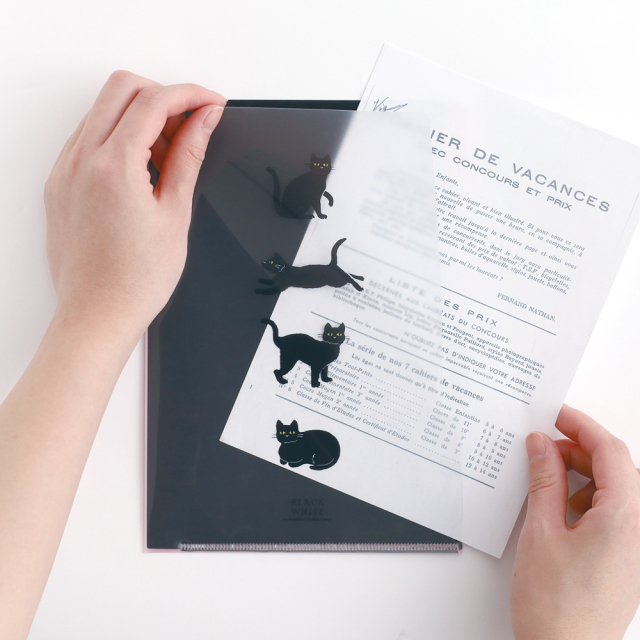 書類や資料を入れることでオバケ、クロネコの絵柄が見え隠れする仕掛けがたのしいA5サイズのクリアファイル。