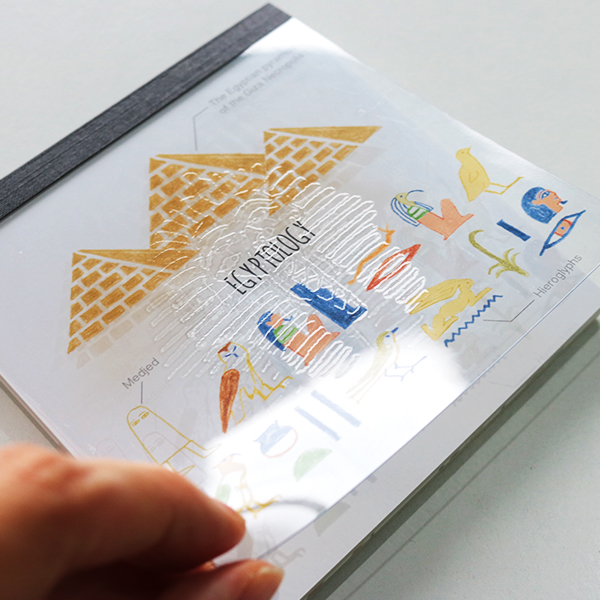 表紙はクリアタイプの硬質塩ビに盛り上げエンボスプリントされています。