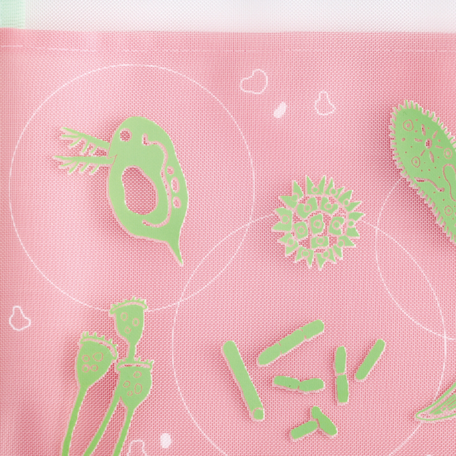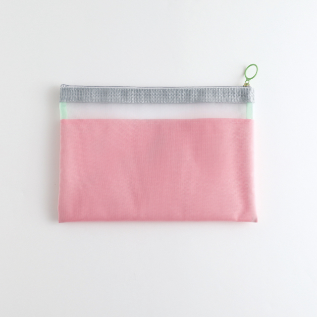 見せたいものと見せたくないものを分けることができ、前後のデザインの重なりも楽しめる学べるメッシュポーチです。