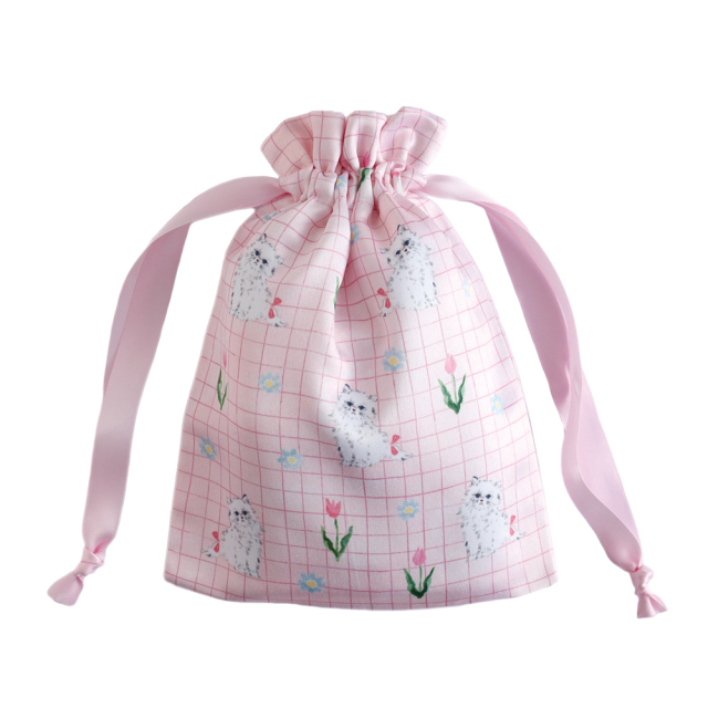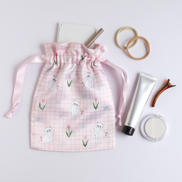 コスメやモバイルアクセサリーなどの小物をまとめるのにちょうどいいサイズ感の巾着です。